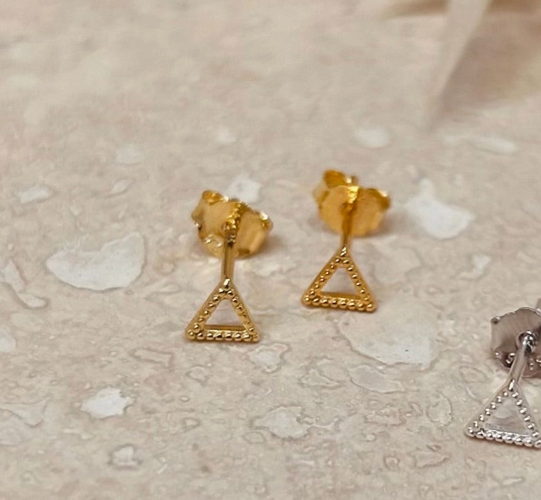 A pair of simple triangle outline studs in a gold setting. They can be worn on their own for a minimal look, but work well as everyday studs for second or third lobe piercings.